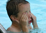 What is it? Eyes and skin can become irritated after spending time in the pool for various reasons. Out of balance pool parameter, specifically pH, can cause eye and skin irritation in swimmers. A build up of contaminants in pool water can also create chloramines (a chlorine smell) and contribute to eye/skin irritation.